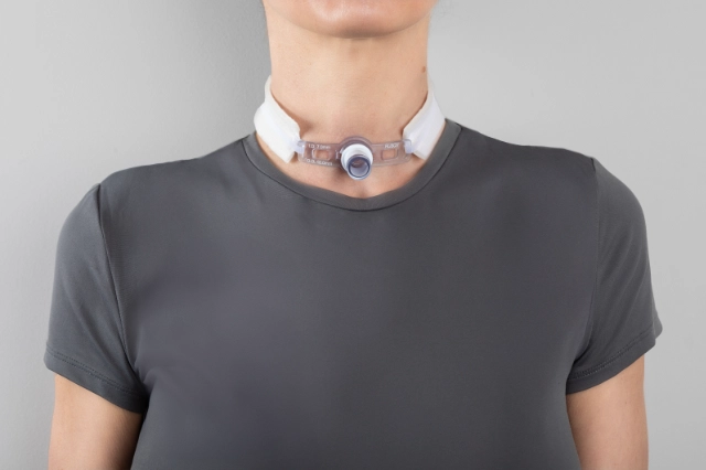 Application product for the attachment of the tracheostomy cannula and its fastening around the neck by means of velcro.